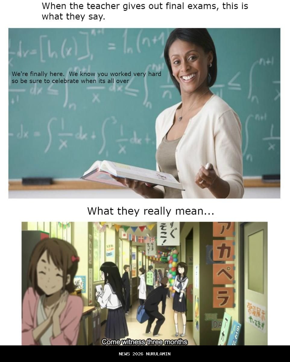 Kreator meme ini telah menciptakan kumpulan meme anime yang menggambarkan berbagai situasi umum saat menghadapi ujian akhir. Mulai dari hasil yang tidak sesuai ekspektasi hingga soal-soal yang tiba-tiba sulit, semua hal ini diangkat dengan humor dan kekocakkan. Berikut adalah beberapa contoh meme yang mungkin kamu kenali: