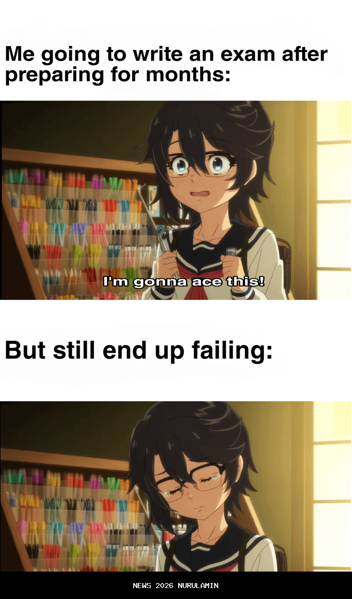Ujian akhir sering kali menjadi momen yang penuh tekanan bagi para pelajar. Banyak dari mereka berusaha belajar sekeras mungkin untuk mendapatkan nilai yang memuaskan. Namun, terkadang hasilnya tidak sesuai dengan harapan. Kegagalan ini bisa membuat seseorang merasa sedih dan kecewa. Namun, dalam situasi seperti ini, meme anime bisa menjadi cara yang menyenangkan untuk menghibur diri dan melihat sisi lucu dari pengalaman ujian akhir.