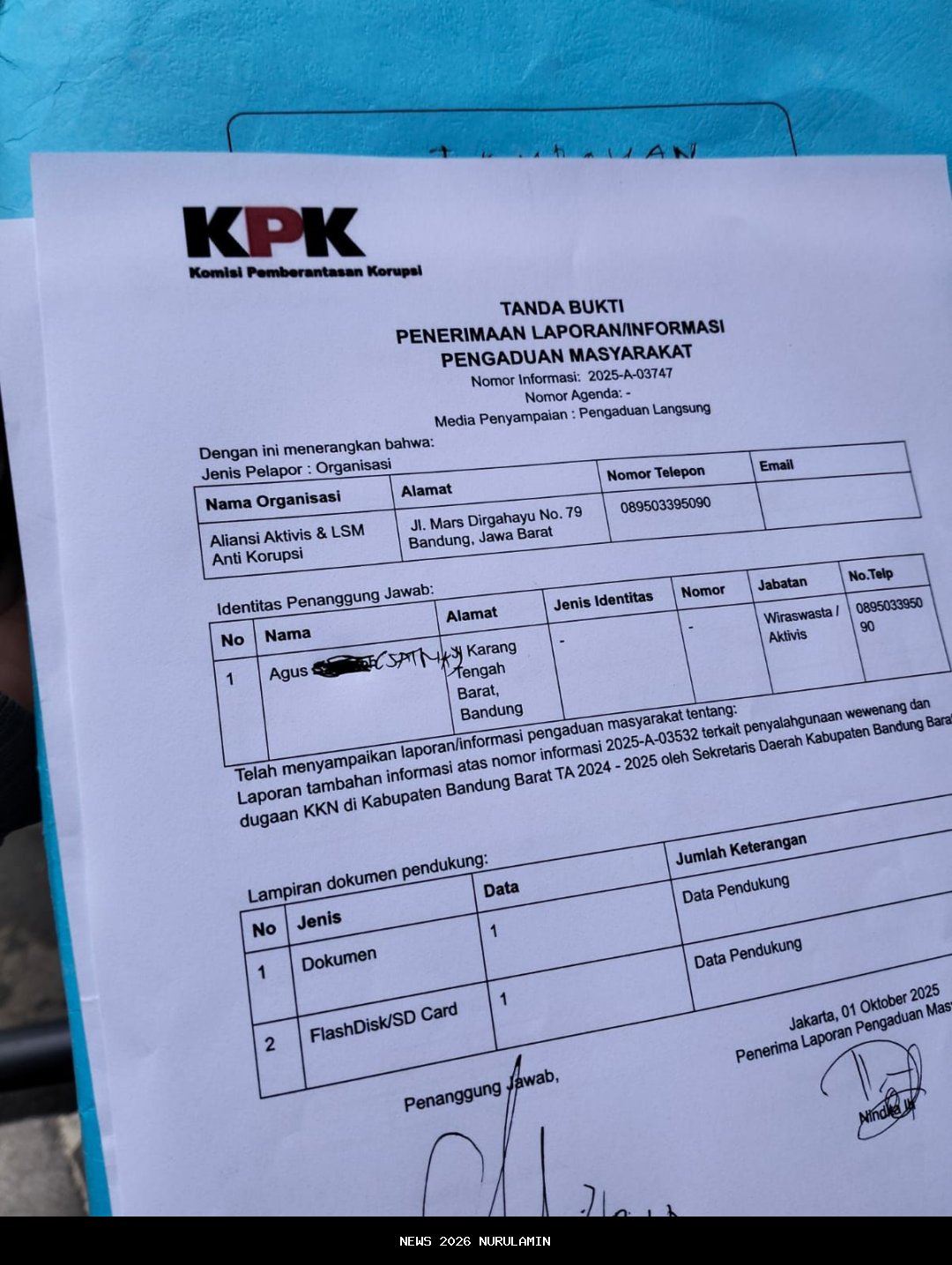 Berkas yang diserahkan berupa satu bundel dokumen dan satu flash disk berisi data dukungan atas laporan sebelumnya. “Hari ini kami kembali ke KPK untuk menyampaikan berkas tambahan sesuai resi penerimaan. Informasinya, dokumen tersebut langsung ditelaah oleh tim KPK,” ujar Agus Satria usai menyerahkan laporan.