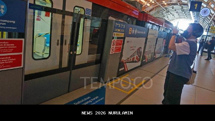 Rangkaian kereta TS 20 LRT Jabodebek melakukan uji coba di Stasiun LRT Dukuh Atas, Jakarta, 16 Juni 2025. Tempo/Ilham Balindra