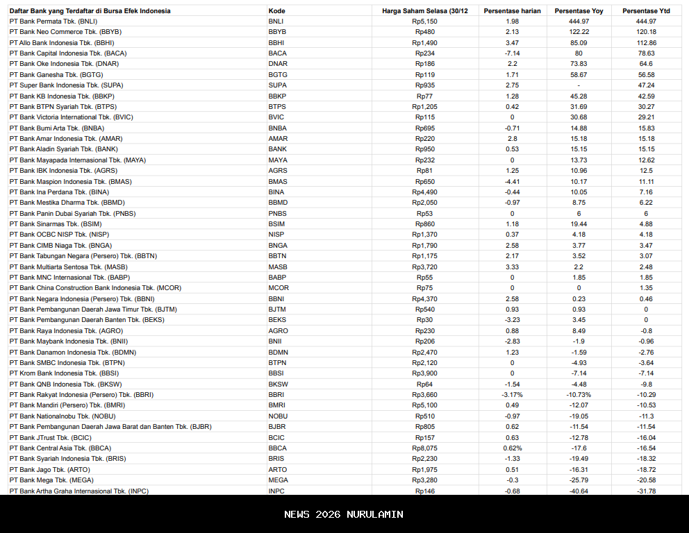 Di sisi lain, saham bank-bank besar justru masih berada di zona koreksi hingga akhir perdagangan di Bursa Efek Indonesia (BEI), Selasa (30/12/2025).