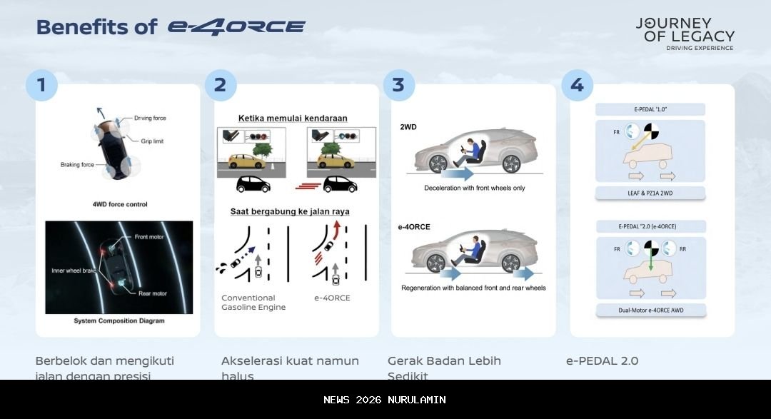 Dalam kondisi menikung tajam, e-4ORCE akan menerapkan gaya pengereman di roda bagian dalam dan gaya dorong di roda luar agar mobil tetap menempel di lintasan tanpa kehilangan traksi. Bima menambahkan, sistem ini juga memberikan akselerasi yang kuat namun tetap halus, terutama saat pengemudi ingin menyalip atau melewati jalan menurun.