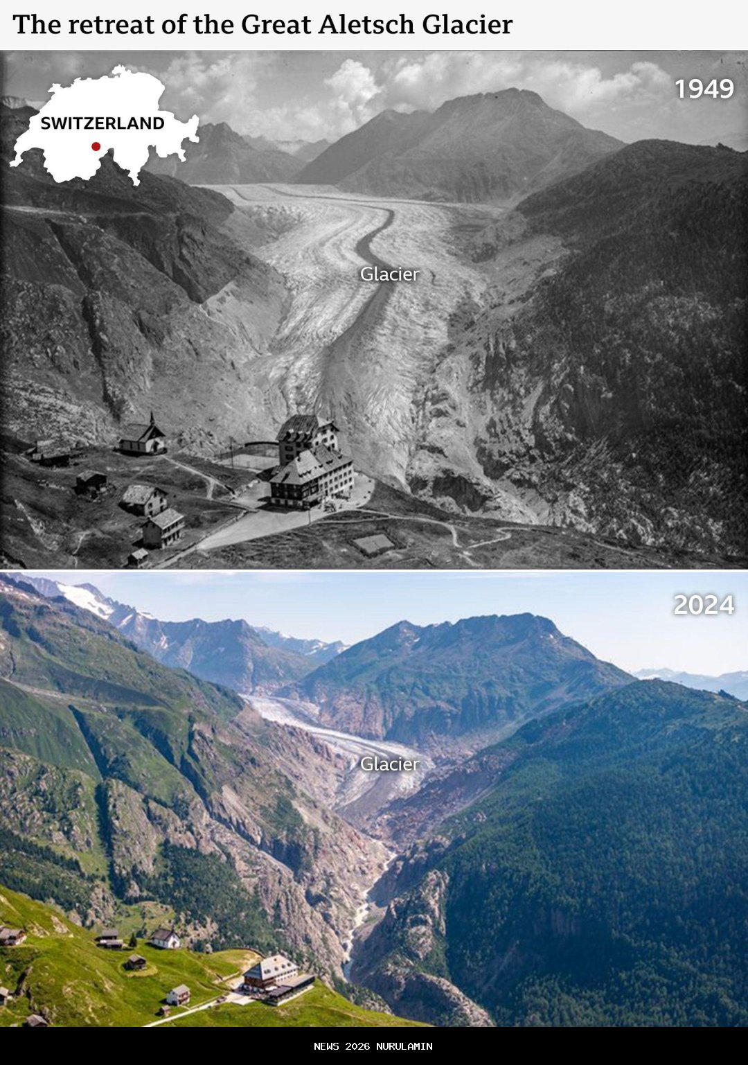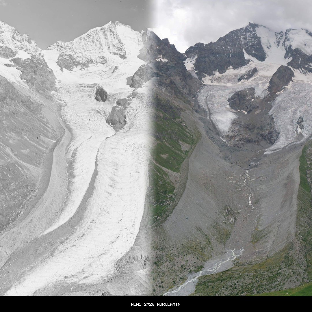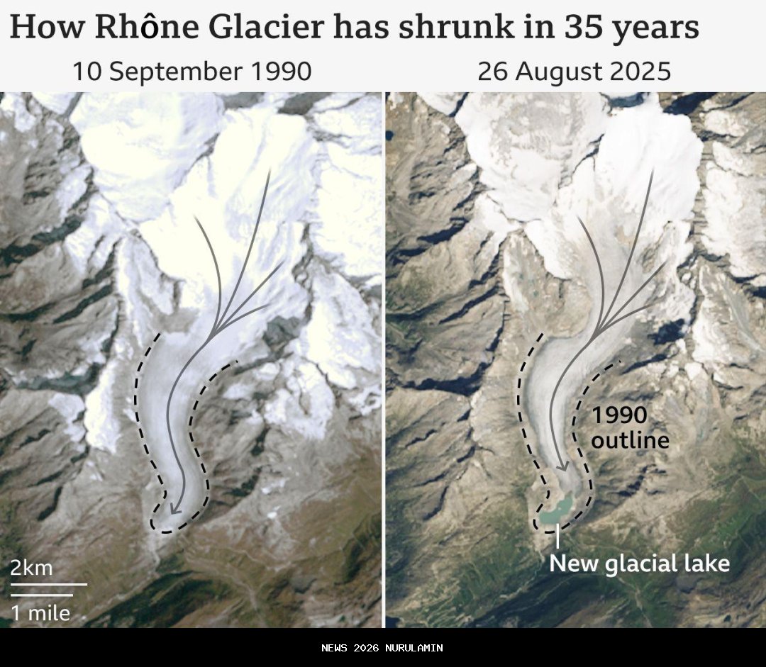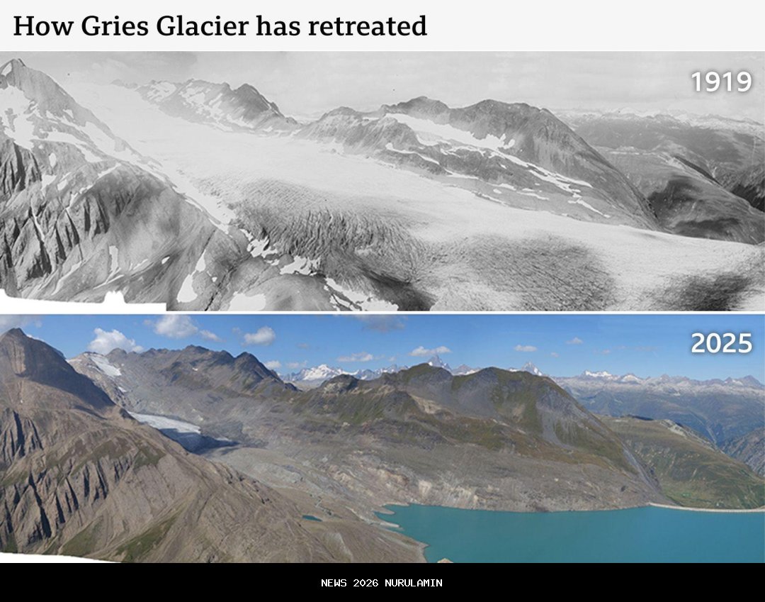 Gambar atas: Gletser Tschierva, Pegunungan Alpen Swiss, pada tahun 1935 dan 2022. Kredit: swisstopo dan VAW Glaciology, ETH Zurich. Laporan tambahan oleh Dominic Bailey dan Erwan Rivault.