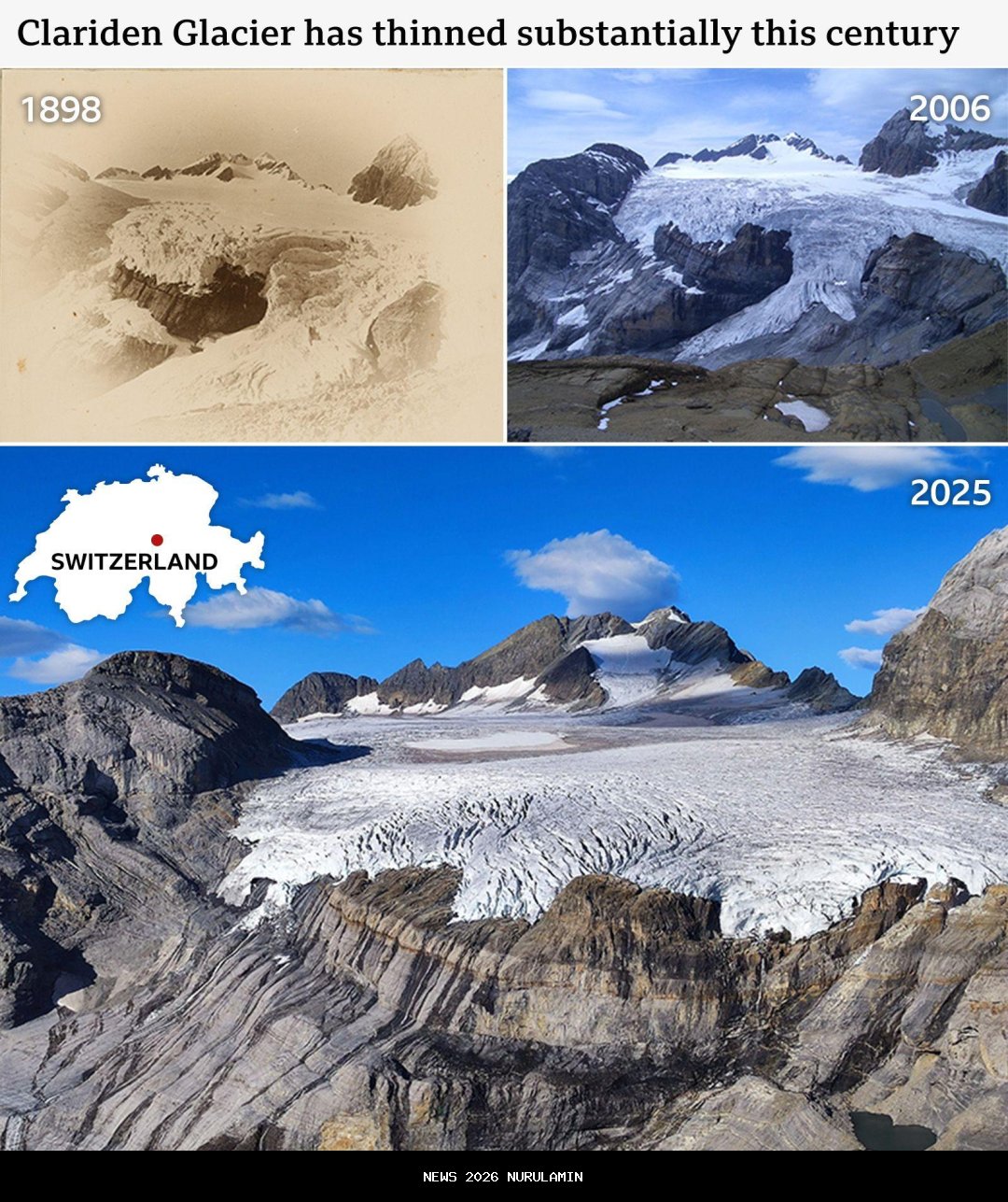 Profesor glasiologi di Universitas Oslo, Regine Hock, yang telah mengunjungi Pegunungan Alpen sejak 1970-an, menyatakan, "Apa yang kita lihat sekarang adalah perubahan yang sangat besar dalam beberapa tahun." Gletser Clariden di Swiss timur laut sebelumnya seimbang hingga akhir abad ke-20, tetapi sekarang mencair dengan cepat.