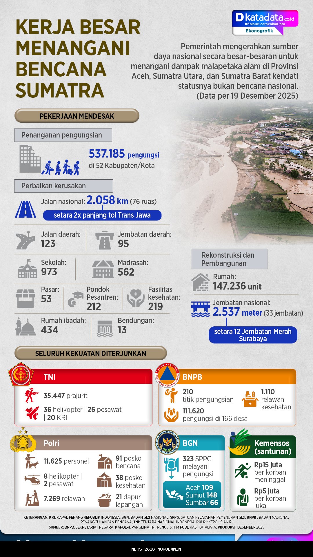 Memasuki fase rekonstruksi dan pembangunan, pemerintah menyiapkan pembangunan kembali 147.236 unit rumah bagi warga terdampak. Di sektor konektivitas, rekonstruksi mencakup 33 jembatan nasional dengan total panjang 2.537 meter, setara dengan 12 kali panjang Jembatan Merah Surabaya, guna memulihkan akses logistik dan mobilitas masyarakat.