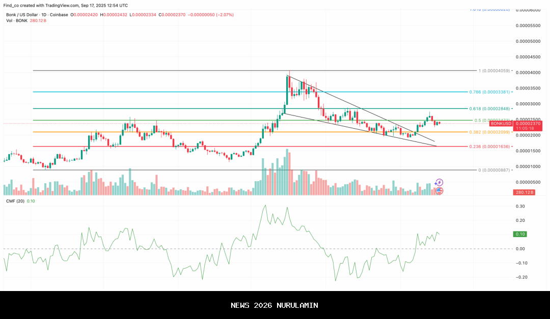 - BONK membentuk dasar dekat $0,000022 dan breakout dari wedge yang menurun.