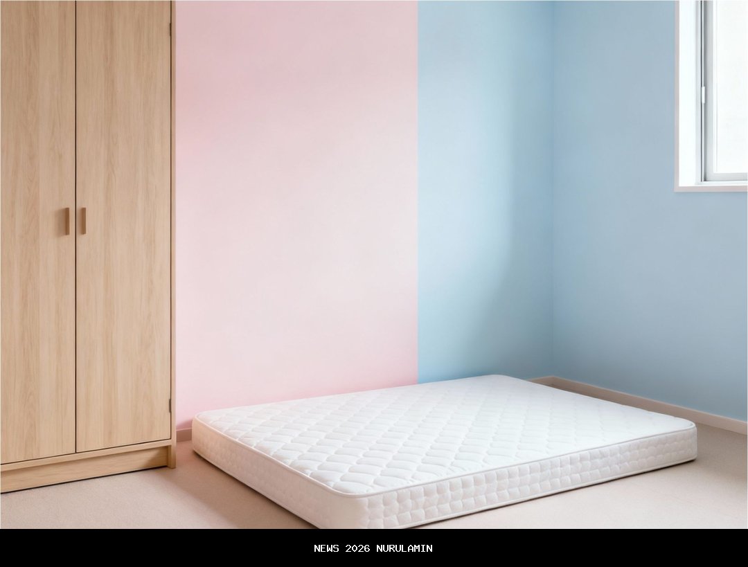 Jika kamu ingin kamar tampil lebih ekspresif, desain tanpa ranjang dengan dinding berwarna-warni bisa menjadi solusi yang tepat. Perpaduan antara biru muda, kuning lembut, dan pink pastel memberikan kesan seru namun tetap nyaman. Kasur lantai dan karpet tebal di bawahnya juga memberikan kesan santai dan praktis, cocok untuk kamar kos.