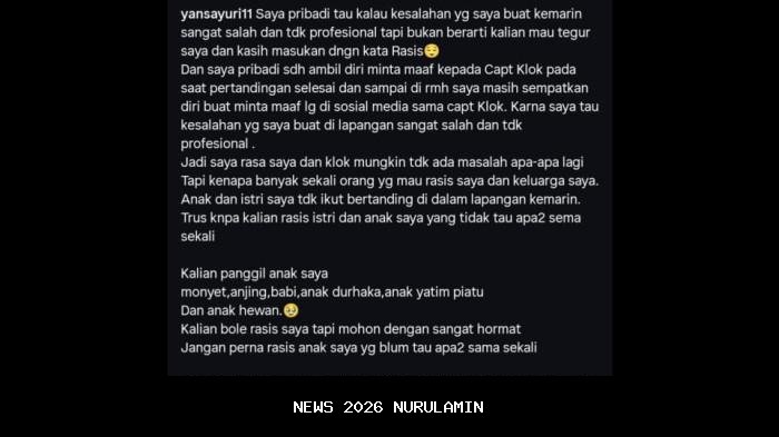 "Saya pribadi tahu kalau kesalahan yang saya buat kemarin sangat salah dan tidak profesional tapi bukan berarti kalian mau tegus saya dan kasih masukan dengan kata rasis. Dan saya pribadi sudah ambil diri minta maaf kepada caps Klok pada saat pertandingan selesai dan sampai rumah saya masih sempatkan diri buat minta maaf lagi di sosial media sama capt Klok."