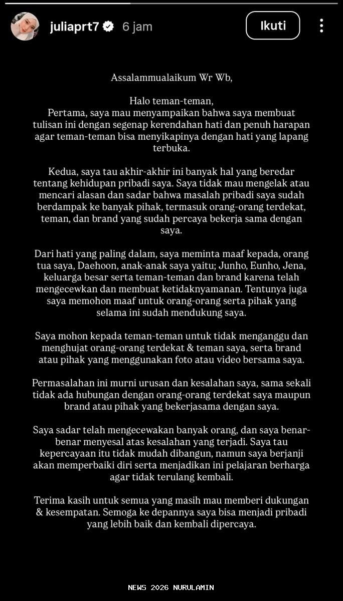 Beberapa hari terakhir, Jule alias Julia Prastini menjadi sorotan netizen karena isu perselingkuhannya. Skandal ini menimbulkan kekecewaan baik dari sisi Na Daehoon, suaminya, maupun para pengikut yang mengikuti perjalanan cinta mereka. Setelah cukup lama bungkam, Jule akhirnya memberikan pernyataan melalui Instagram @juliaprt7 pada Minggu (26/10/2025). Berikut adalah isi pernyataan lengkapnya.