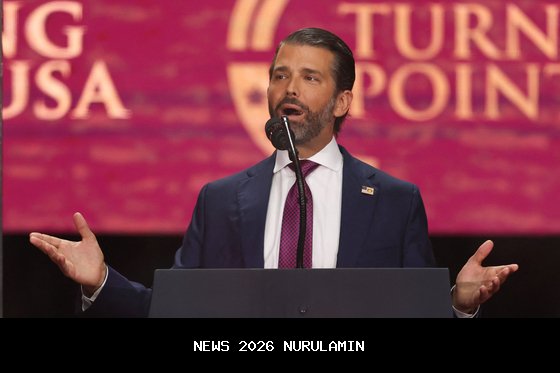 Putra Presiden Amerika Serikat Donald Trump, Donald Trump Jr., berbicara selama upacara perayaan publik untuk aktivis sayap kanan Charlie Kirk di Stadion State Farm di Glendale, Arizona, pada 21 September. [AFP/YONHAP]