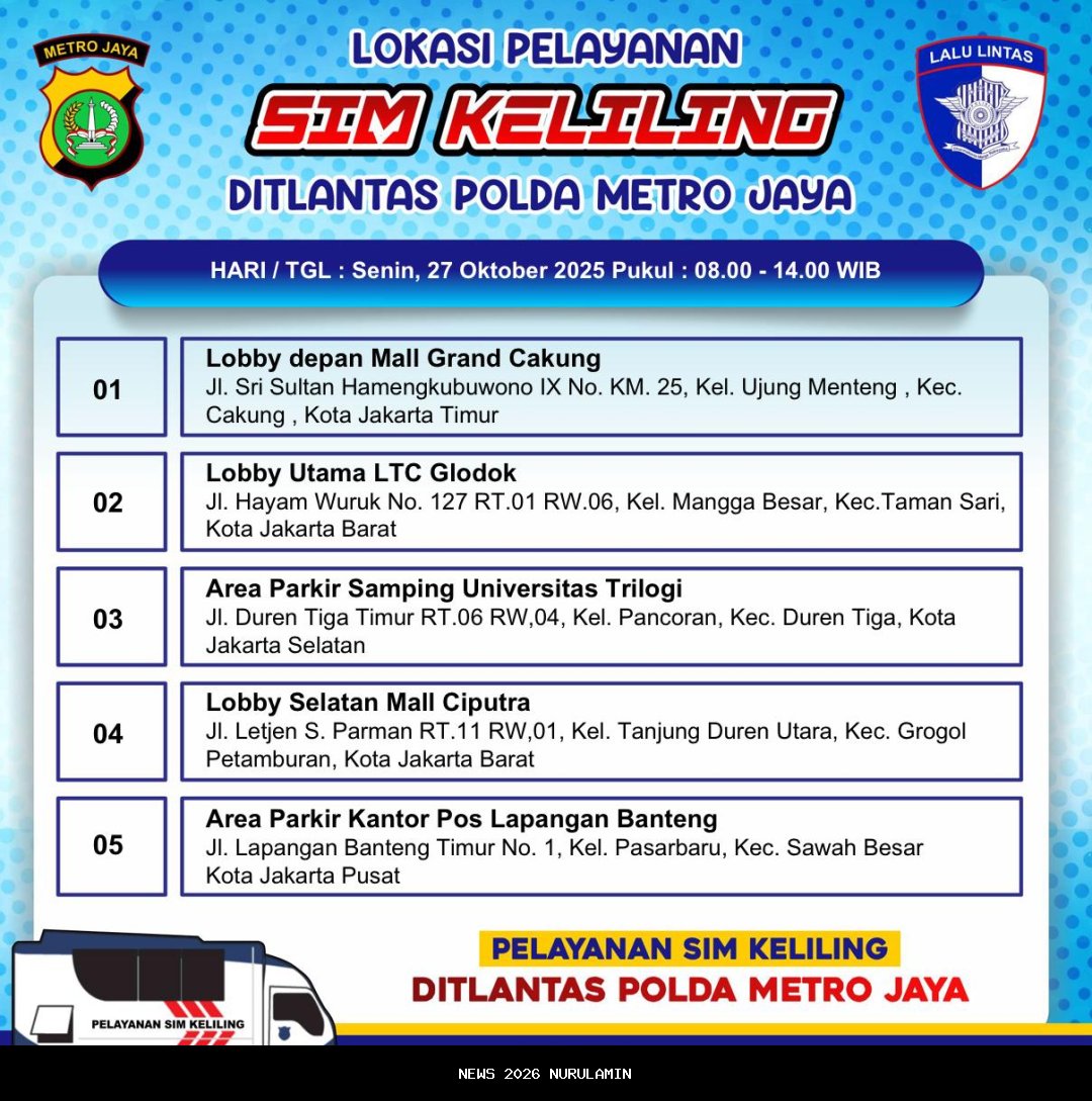 Pada hari Senin (27/10/2025), layanan SIM Keliling kembali dibuka oleh Ditlantas Polda Metro Jaya. Warga dapat memperpanjang SIM A dan SIM C di lima wilayah Jakarta, mulai pukul 08.00 hingga 14.00 WIB. Layanan ini tersedia di sejumlah titik yang telah disiapkan.