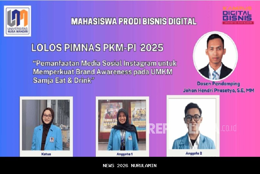 Sebuah prestasi yang membanggakan kembali diraih oleh mahasiswa Program Studi Bisnis Digital, Fakultas Ekonomi dan Bisnis Universitas Nusa Mandiri (UNM). Tim mahasiswa UNM berhasil lolos sebagai peserta Pekan Ilmiah Mahasiswa Nasional (PIMNAS) ke-38 Tahun 2025. Mereka bergabung bersama 170 perguruan tinggi dari seluruh Indonesia, dan menjadi salah satu perwakilan dari Wilayah III (LLDikti III) Jakarta.