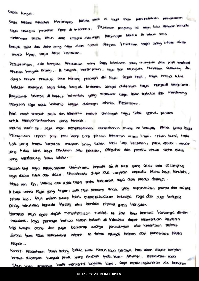 - Di tengah berbagai tantangan yang dihadapi perusahaannya, pendiri promotor K-pop Mecimapro (MCP), yang dikenal sebagai Melani, merilis surat terbuka yang berisi permohonan maaf kepada berbagai pihak. Dalam surat tersebut, ia mengakui adanya banyak kesalahan dan kekecewaan yang ditimbulkan, seraya mengungkapkan kondisi sulit yang tengah dialami perusahaannya.