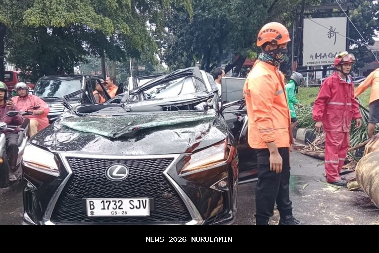 Sebuah mobil Lexus mengalami kecelakaan setelah tertimpa pohon yang tumbang di wilayah Pondok Indah, Jakarta Selatan, pada hari Minggu (26/10/2025). Peristiwa ini terjadi saat hujan deras disertai angin kencang mengguyur wilayah tersebut pada sore hari.