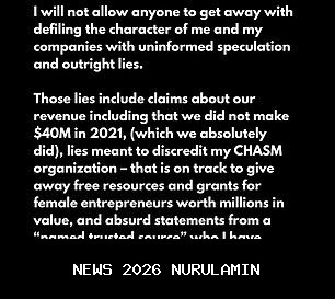 "Kesaksian palsu itu mencakup klaim tentang pendapatan kami, termasuk bahwa kami tidak mendapatkan $40 juta pada 2021 (yang benar-benar kami lakukan), kesaksian palsu yang dimaksudkan untuk merusak organisasi Chasm saya - yang berada di jalur untuk memberikan sumber daya dan hibah gratis bagi pengusaha perempuan senilai jutaan dolar, dan pernyataan tidak masuk akal dari seorang 'sumber tepercaya yang disebutkan' yang bahkan saya tidak pernah bertemu langsung atau berinteraksi dengannya," lanjutnya.
