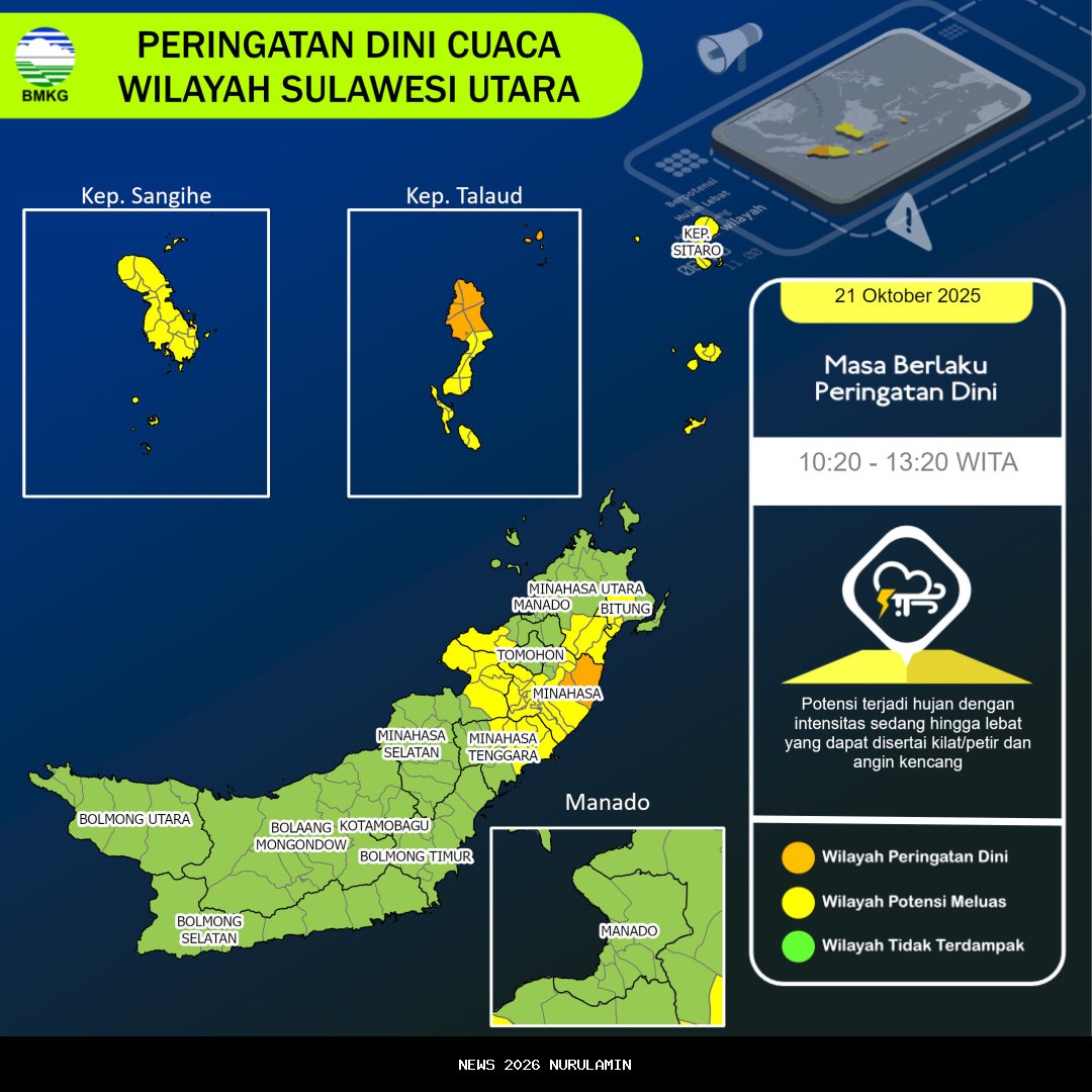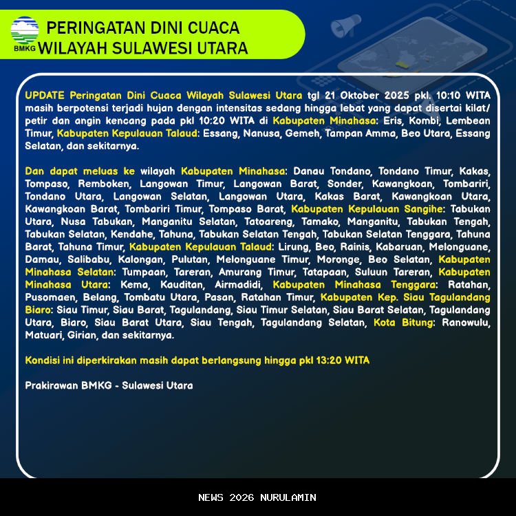 Pada hari Selasa, 21 Oktober 2025, Badan Meteorologi, Klimatologi, dan Geofisika (BMKG) memberikan informasi mengenai potensi cuaca ekstrem yang dapat terjadi di sejumlah wilayah di Sulawesi Utara. Informasi ini dikeluarkan pada pukul 10.10 WITA dan diperkirakan akan berlangsung hingga pukul 13.20 WITA.