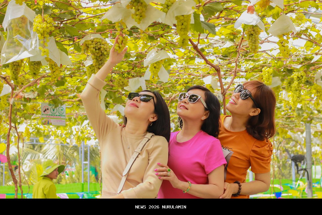 | Pengunjung dapat menikmati ruang hijau yang sejuk, memetik buah anggur Shine Muscat Jepang di Kebun Suoi Tien. Foto courtesy dari Suoi Tien |