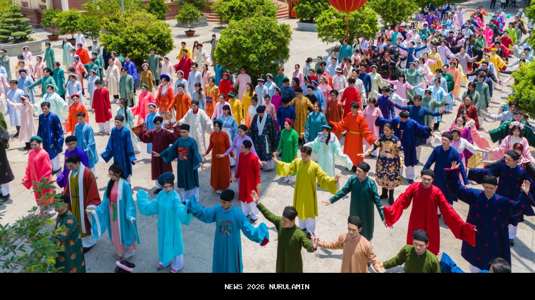 | Ruang yang dipenuhi rasa bangga nasional untuk Hari Peringatan Raja-Raja Hung 2025, dengan lebih dari 1.000 orang berpakaian adat Vietnam. Foto courtesy dari Suoi Tien |