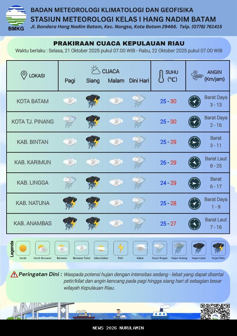 Badan Meteorologi, Klimatologi dan Geofisika (BMKG) Hang Nadim Batam telah merilis prakiraan cuaca untuk wilayah Kepulauan Riau (Kepri) pada hari ini, Selasa (21/10/2025). Berdasarkan laporan yang dikeluarkan, sebagian besar wilayah di Kepri masih berpotensi mengalami hujan dengan intensitas ringan hingga lebat. Langit akan dominan berawan tebal, terutama di kawasan Batam, yang diprediksi akan diguyur hujan lebat pada siang hari.