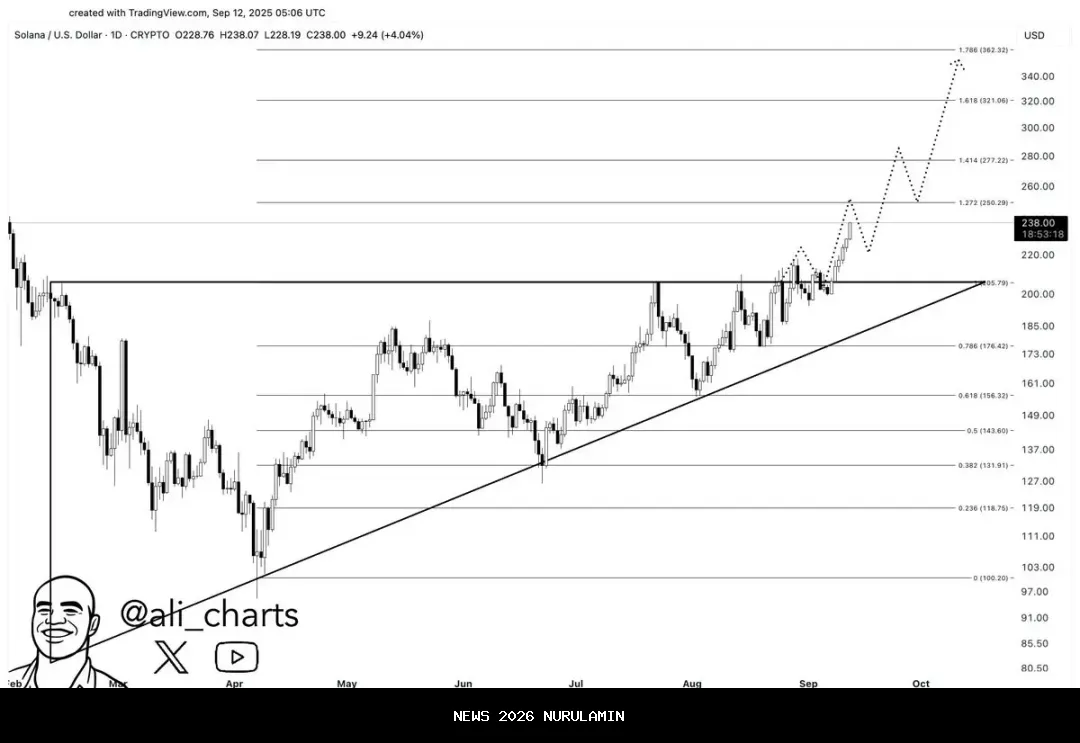 Prediksi harga Solana kini menjadi salah satu topik paling dibicarakan di ruang kripto, karena SOL telah naik 18 persen dalam seminggu terakhir dan hampir 89 persen dalam tiga bulan terakhir. Setelah mencoba $245, para analis sepertiAli Martinezpercaya bahwa Solana dapat segera mencapai $360, dengan dukungan kuat di $239 dan $224. Persetujuan ETF SOL di pasar tunai juga diharapkan akan mempercepat permintaan, mirip dengan bagaimana ETP Bitcoin dan Ethereum memicu aliran dana yang besar.