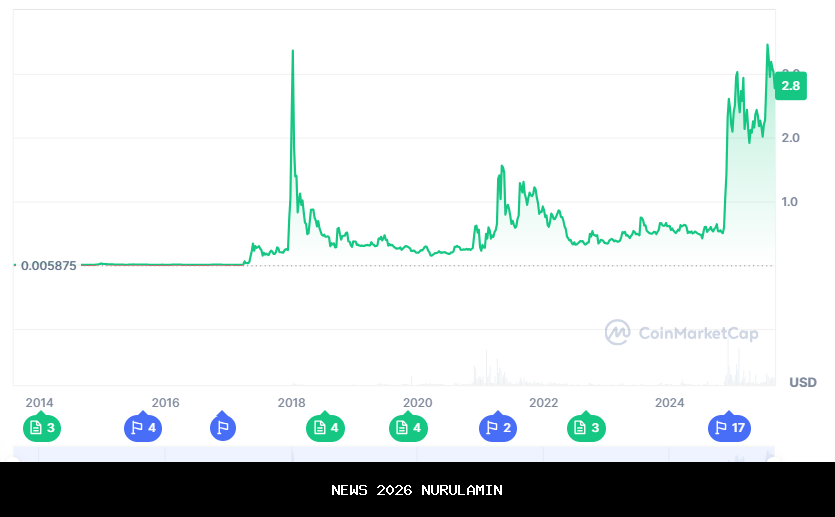 - Sebelum 2017, nilai aset tersebut berada sekitar $0,01; pada April 2017, naik menjadi $0,05; kenaikan perlahan terus berlanjut hingga mencapai $0,25 pada Mei, menunjukkan pergerakan harga yang positif seiring Ripple terus berkembang.