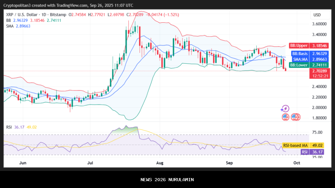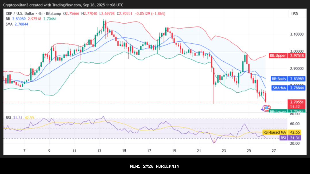 Pada 26 September 2025, analisis harga XRP menunjukkan tren bearish karena harga terus turun. Harga koin saat ini berdagang di $2,70 setelah mengalami depresiasi berat. Secara bersamaan, kripto ini telah kehilangan 4,08% nilainya dalam 24 jam terakhir. Hal ini menciptakan lingkungan yang tidak menguntungkan bagi pedagang posisi panjang, karena altcoin ini kembali kehilangan nilai setelah gelombang bearish selama dua hari berturut-turut.