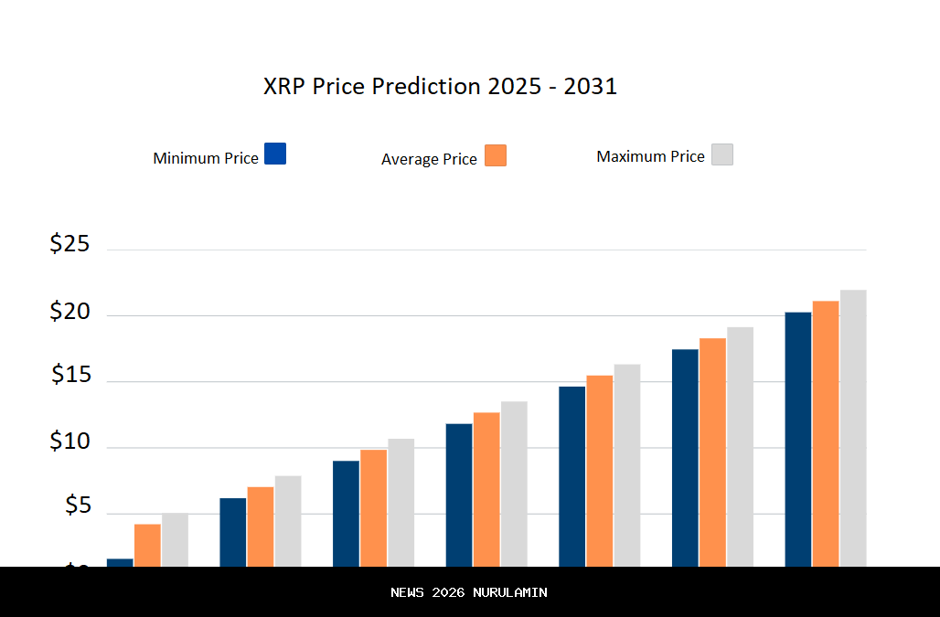 - Pada tahun 2031, harga target untuk XRP berada antara $20,26 hingga $21,95, dengan harga rata-rata $21,11.