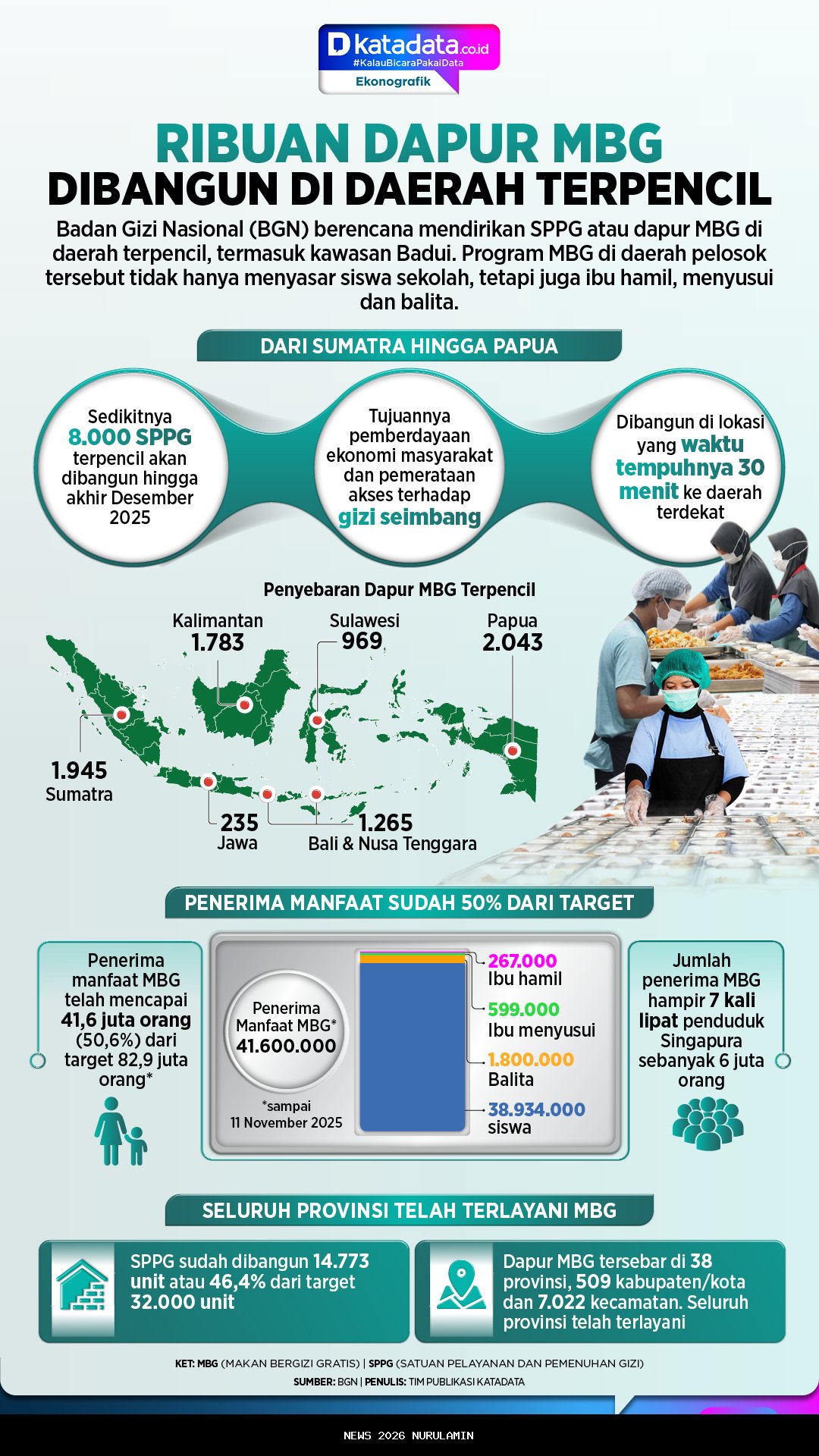 Selain itu, melalui penyediaan total 1,8 miliar porsi makan, program MBG telah melayani 41,6 juta orang, atau lebih dari 50% dari total target 82,9 juta warga.