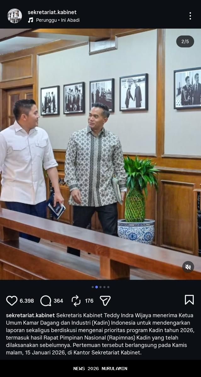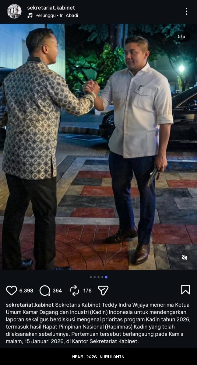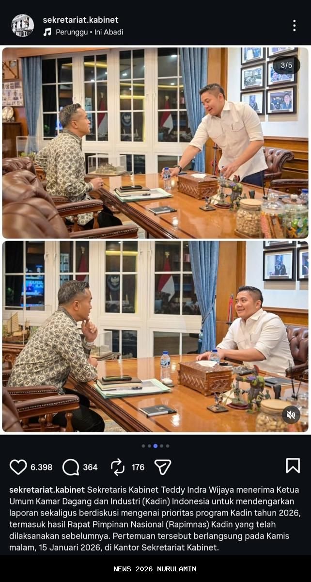Seskab Teddy Indra Wijaya menggelar pertemuan dengan Ketua Umum Kadin Indonesia, Anindya Bakrie. Pertemuan ini berlangsung untuk membahas laporan dan prioritas program Kadin di tahun 2026. Informasi ini disampaikan oleh Teddy melalui unggahan di akun Instagram resmi @sekretariat.kabinet, pada hari Sabtu (17/1/2026).