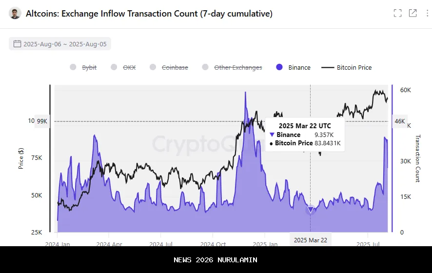 Aliran altcoin ke Binance melonjak ke tingkat yang tidak pernah terlihat sejak November 2024. Perilaku pedagang yang serupa secara historis menunjukkan puncak pasar lokal dan kemungkinan penurunan ke rentang yang lebih rendah.