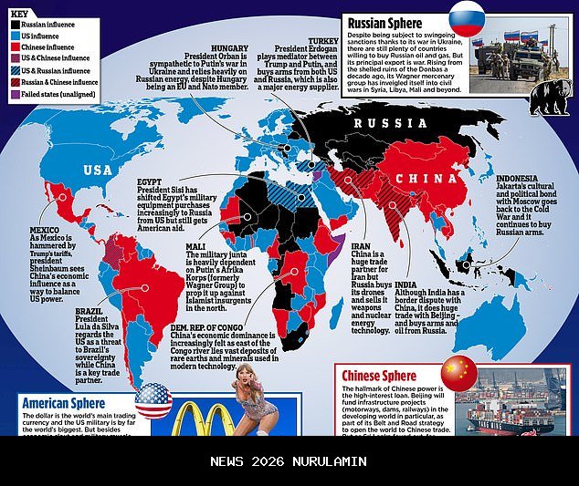 Peta kami menunjukkan pergeseran keseimbangan kekuatan ini dan wilayah-wilayah yang paling sengit diperebutkan. Biru mewakili Amerika Serikat dan negara-negara di bawah pengaruhnya - termasuk sebagian besar Eropa.