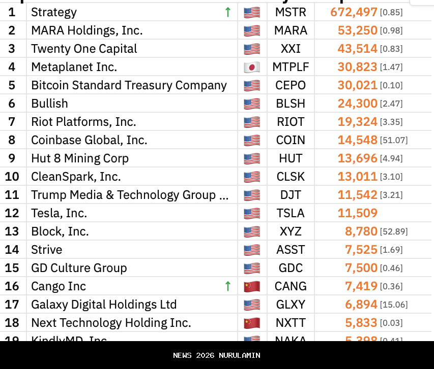 Dipimpin oleh pendiri sekaligus executive chairman Michael Saylor, Strategy mulai mengakumulasi Bitcoin sejak 2020 dan hingga kini tetap menjadi pemegang Bitcoin korporasi terbesar di dunia. Posisi kedua ditempati oleh MARA Holdings, dengan kepemilikan sekitar 53.250 BTC, menurut data BitcoinTreasuries.NET.