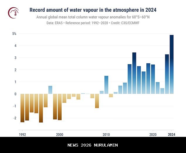 Menurut data yang dikumpulkan Layanan Perubahan Iklim EU (C3S), jumlah air di atmosfer meningkat 4,9 persen dibanding rata-rata tahun 1991-2020 pada tahun 2024.