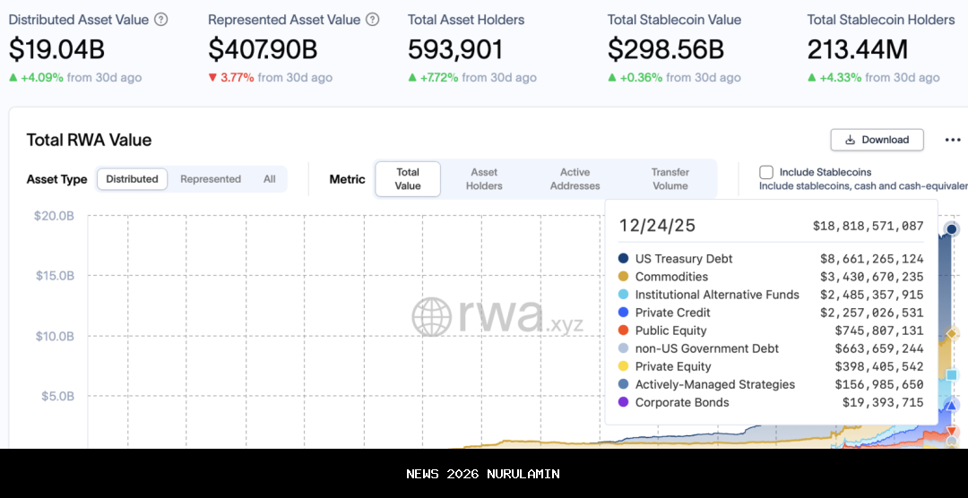 Berdasarkan data dariRWA.xyz, total nilai yang didistribusikan dari aset dunia nyata yang diterbitkan token telah lebih dari tiga kali lipat dalam setahun terakhir, meningkat dari sekitar 5,6 miliar dolar pada akhir 2024 menjadi sekitar 19 miliar dolar hari ini.
