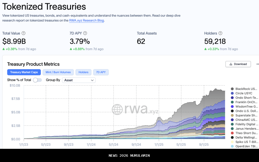 Produk Departemen Keuangan AS menyumbang bagian signifikan dari pertumbuhan tersebut, dengan sekitar 9 miliar dolar dalam utang Treasury yang telah tokenisasi, naik dari sekitar 3,9 miliar dolar pada awal tahun ini.