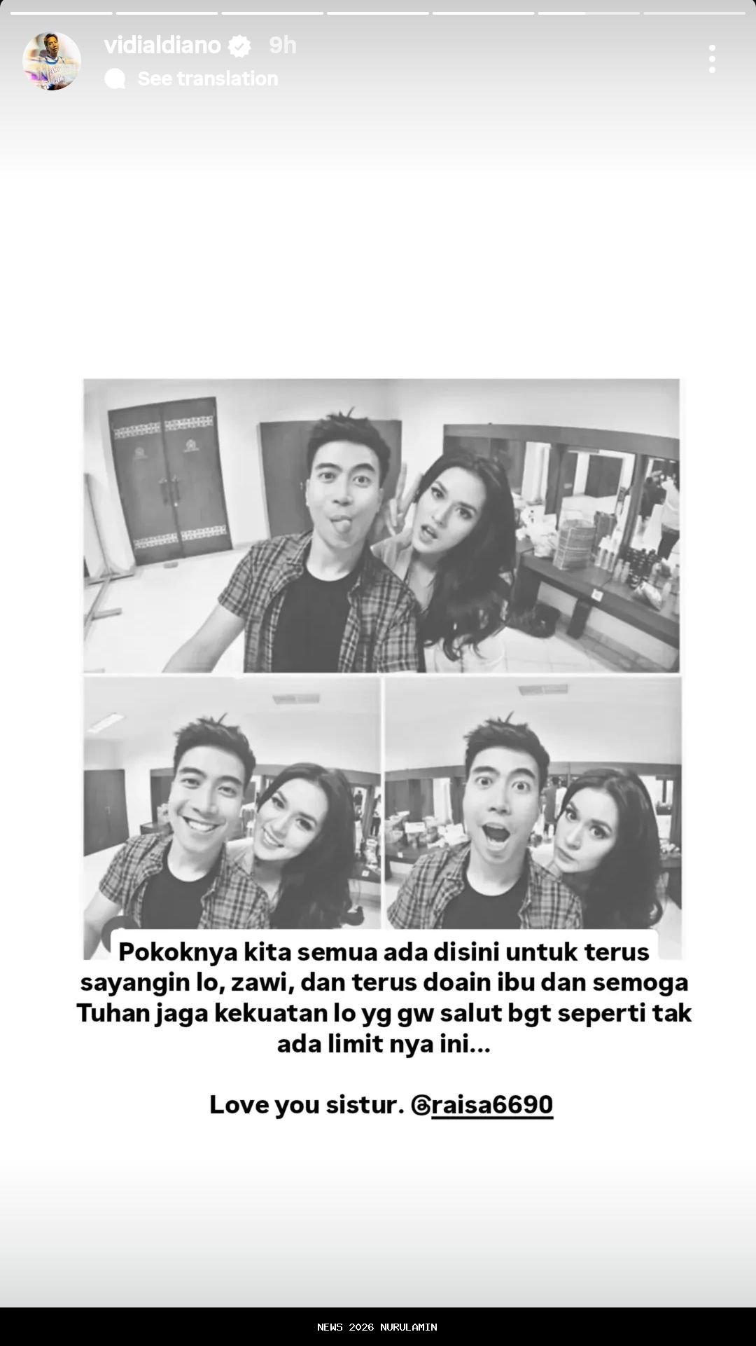 Vidi menunjukkan kepeduliannya melalui unggahan di media sosial yang penuh makna dan haru. Ia membagikan kolase foto hitam-putih yang menampilkan momen keakraban antara dirinya dengan Raisa. Dalam foto-foto tersebut, keduanya terlihat tertawa dan berwajah lucu, menggambarkan ikatan persahabatan yang kuat dan hangat.