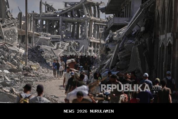 Pengungsi Palestina berjalan melewati bangunan yang hancur saat mereka kembali ke rumah mereka di Khan Younis, Jalur Gaza selatan, Jumat, 10 Oktober 2025. - (Foto AP/Jehad Alshrafi)