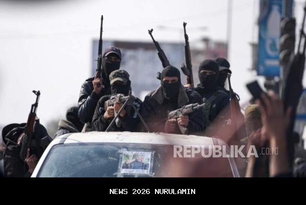 Anggota Brigade Izzedine al-Qassam, sayap bersenjata Hamas, mengambil bagian dalam parade gencatan senjata di Deir al-Balah, Jalur Gaza, Ahad, 19 Januari 2025. - ( AP Photo/Abdel Kareem Hana)