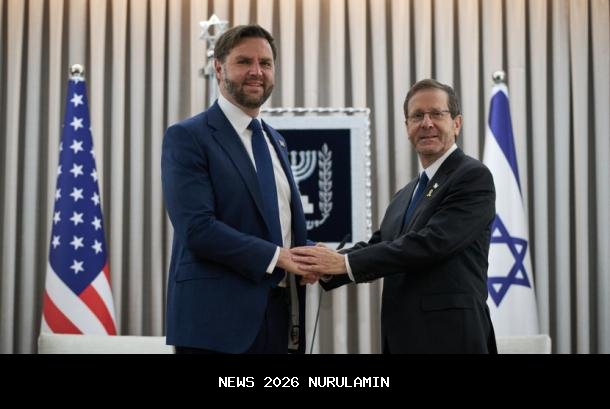 Wakil Presiden AS JD Vance (kiri) bersama Presiden Israel Isaac Herzog usai pertemuan di kediaman presiden, di Yerusalem, Rabu, 22 Oktober 2025. - ( AP Photo/Leo Correa, Pool)